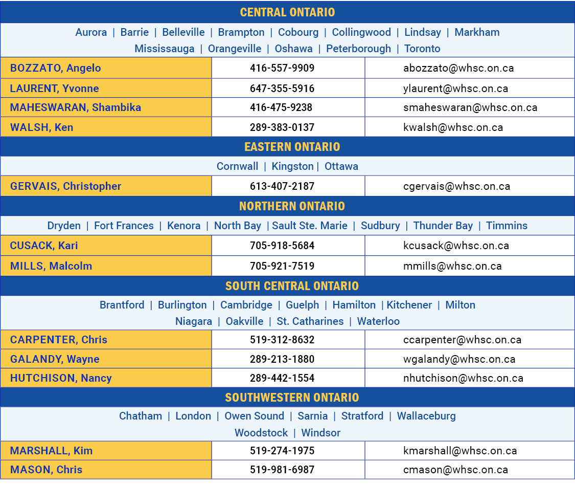 Didn’t find what you need? Be sure to drop us a line or give us a call. You can email us at contactus@whsc.on.ca or call us at 1-888-869-7950. When you do, ask for a training services representative. Or you can contact a rep directly. (See below for details).